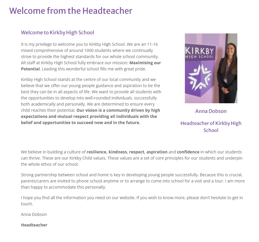 CLICK HERE - Kirkby Collaborative of Schools Letter - Friday 16th January 2026 CLICK HERE - Uniform Letter from the deputy headteacher - Tuesday 16th December 2025 CLICK HERE - Year 11 Prom Letter - Wednesday 10th December 2025 CLICK HERE - Medical Appointments Letter - Monday 1st December 2025 CLICK HERE - Letter from the headteacher - Monday 17th October 2025 CLICK HERE - Year 11 Mock Exam Letter - Thursday 16th October 2025 CLICK HERE - Police Presentation Letter - Thursday 11th September 2025 CLICK HERE - Start of Term letter for new year 7s CLICK HERE - Liverpool Echo Article Regarding Kirkby High School Ofsted Report CLICK HERE - Kirkby High School Ofsted Report |